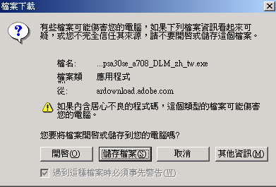 請選擇「儲存檔案」;選擇檔案儲放位置,按下「確定」按鈕後表示您已成功進行Acrobat Reader安裝程式下載。