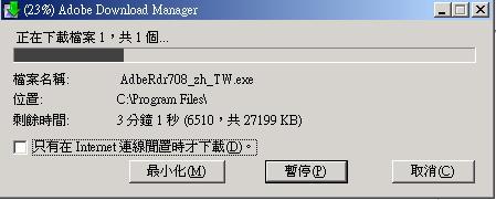 當網頁出現如圖「感謝您下載AdobeReader」字樣的畫面時,系統會自行出現「檔案下載」對話方塊,
