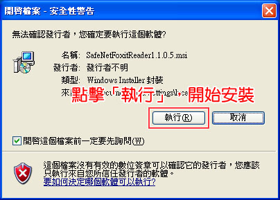 Step2. 下載後,雙擊檔案,在安裝介面中點擊「執行」,開始安裝 ※ 為什麼下載了 SafeNet Foxit Reader的安裝檔後按兩下無法自動安裝,會一直用其他軟體