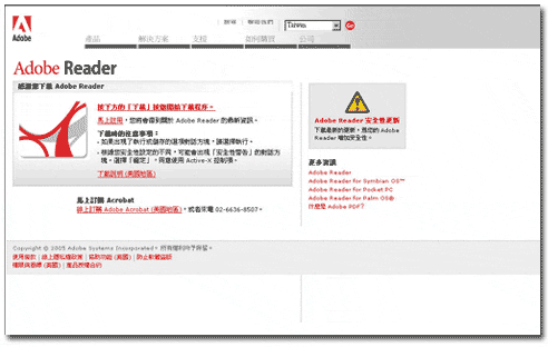 中文網站下載Adobe reader 7.0以上版本(j請務必下載7.0x版): 注意:目前Adobe reader 8.0版本對於開啟DRM文件有列印上的Bug,若已經安裝Adobe reader 8.0的讀者,請先移除Adobe reader 8.0後,再進行安裝Adobe Reader 7.0.9。 |